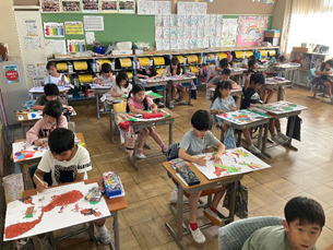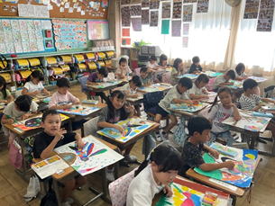 1年生の子どもたちは「むしはかせになろう」とクレヨンや絵の具で絵を描いています。 こすりだしやスクラッチなどの技法を工夫して取り入れる姿も多く見られました。 すてきな作品になりそうです。